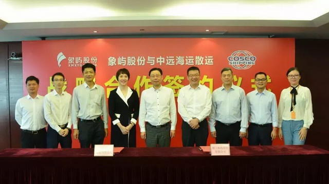 8月3日,廈門象嶼股份有限公司與中遠(yuǎn)海運散貨運輸有限公司舉行戰(zhàn)略合作協(xié)議簽署儀式。象嶼股份黨委書記、總經(jīng)理鄧啟東、中遠(yuǎn)海運散運黨委副書記、總經(jīng)理楊志堅分別代表雙方公司在戰(zhàn)略合作協(xié)議上簽字,象嶼股份副總經(jīng)理、象嶼速傳總經(jīng)理肖靜勤、中遠(yuǎn)海運散運營銷中心總監(jiān)謝光盛等領(lǐng)導(dǎo)出席了簽約儀式。